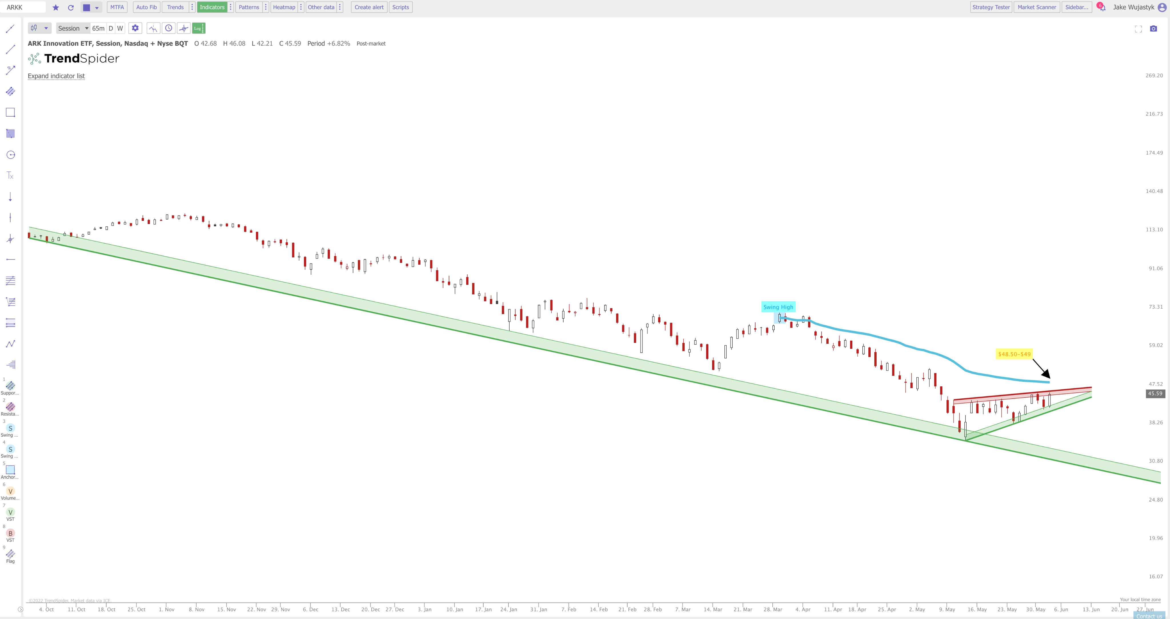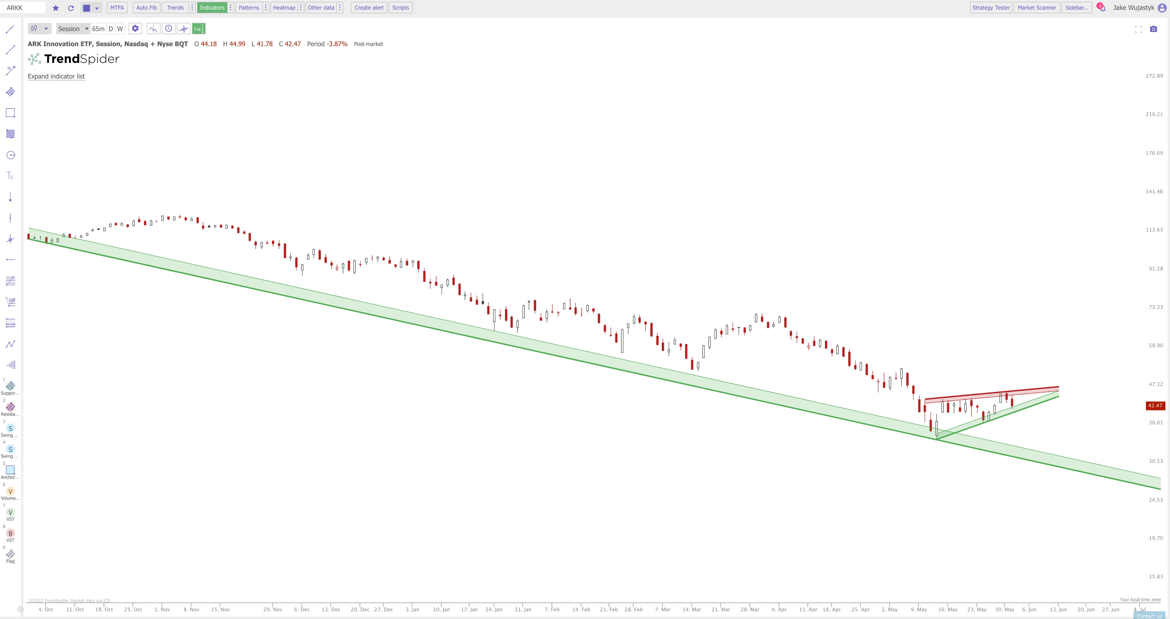 From its peak VTI has fallen about 15 but ARKK has fallen 71. At its peak VTI was up 199 and ARKK at its peak was up 596. ARK Investment Management LLC is an American investment management firm based in St.
